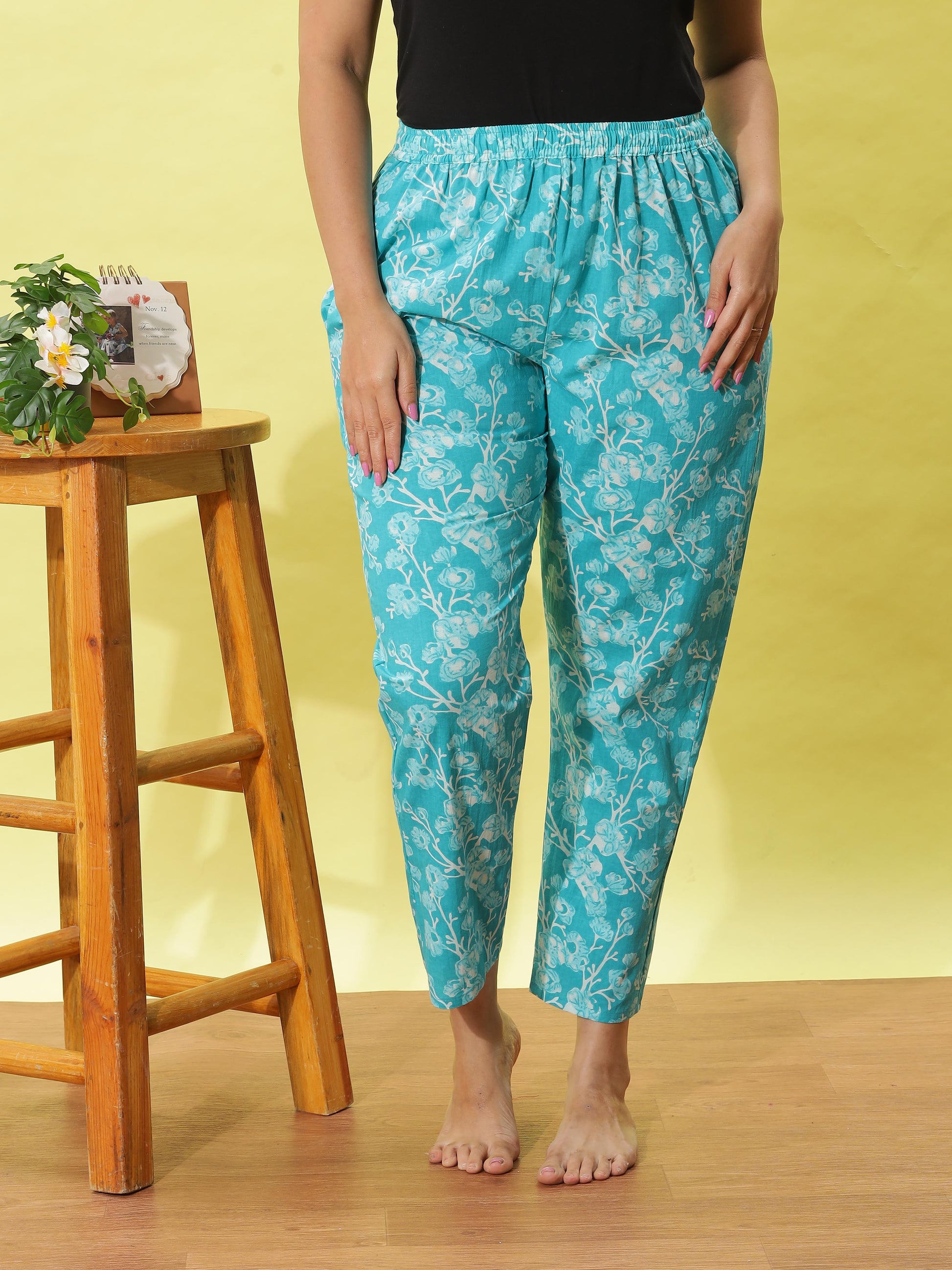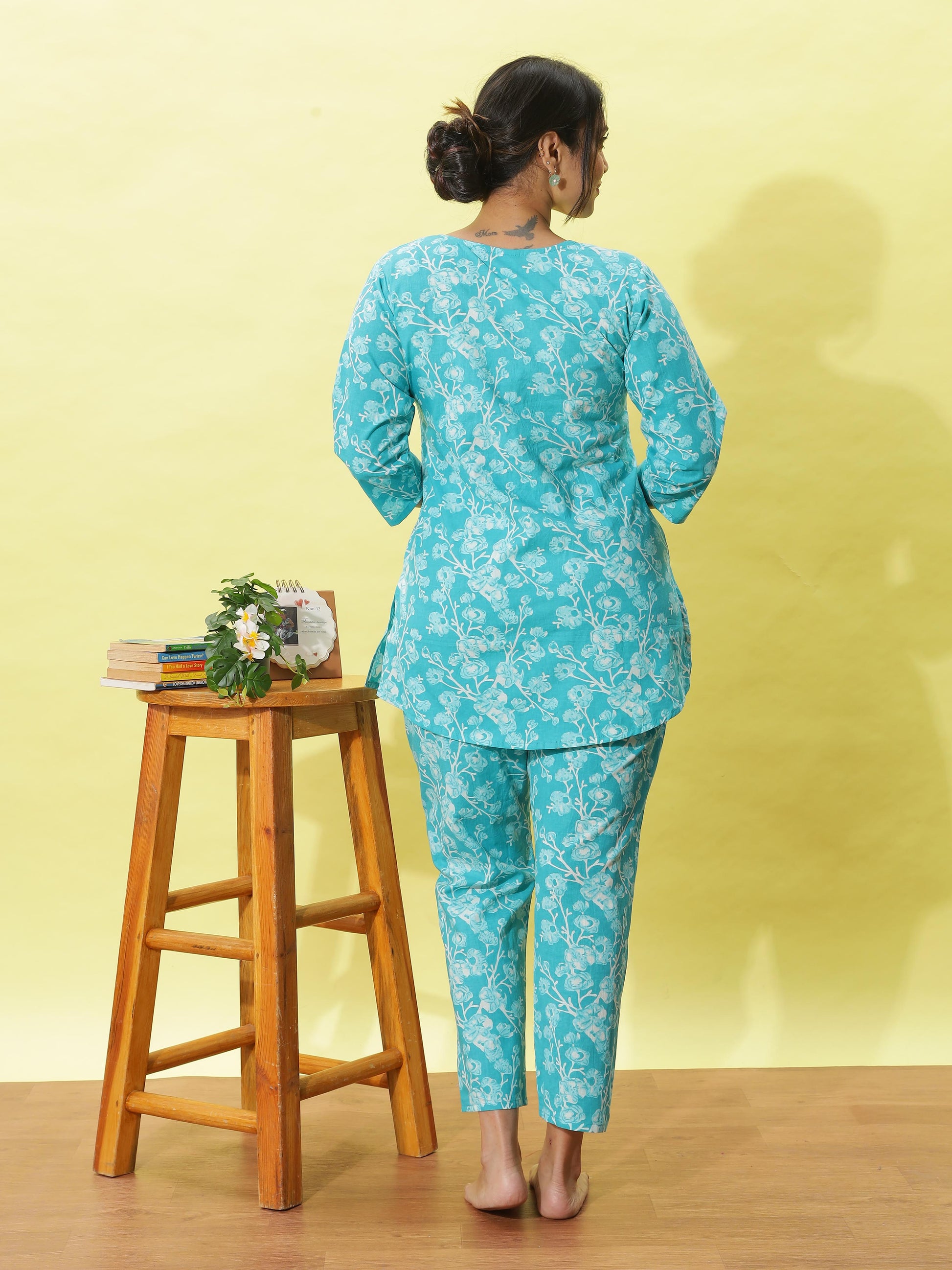 Aqua Blue Cotton Pyjama Set for Women Floral Nightwear & Loungewear