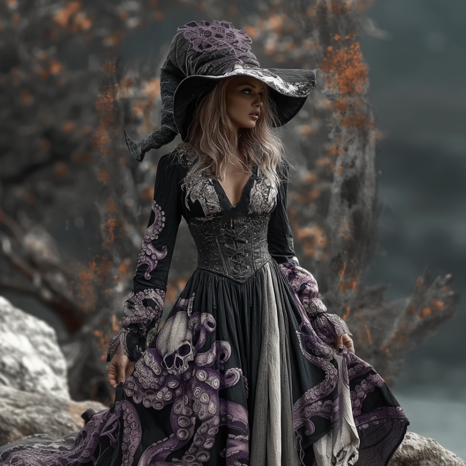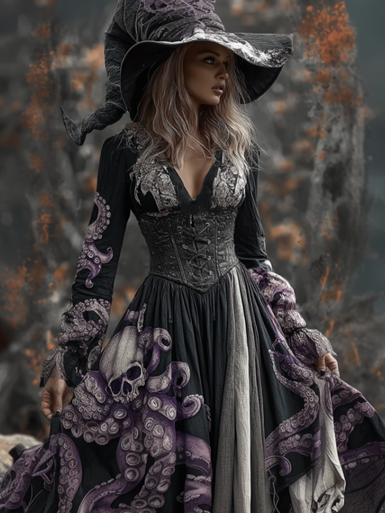 Lady's Halloween Skeleton Octopus Retro Cotton And Linen V-neck Dress