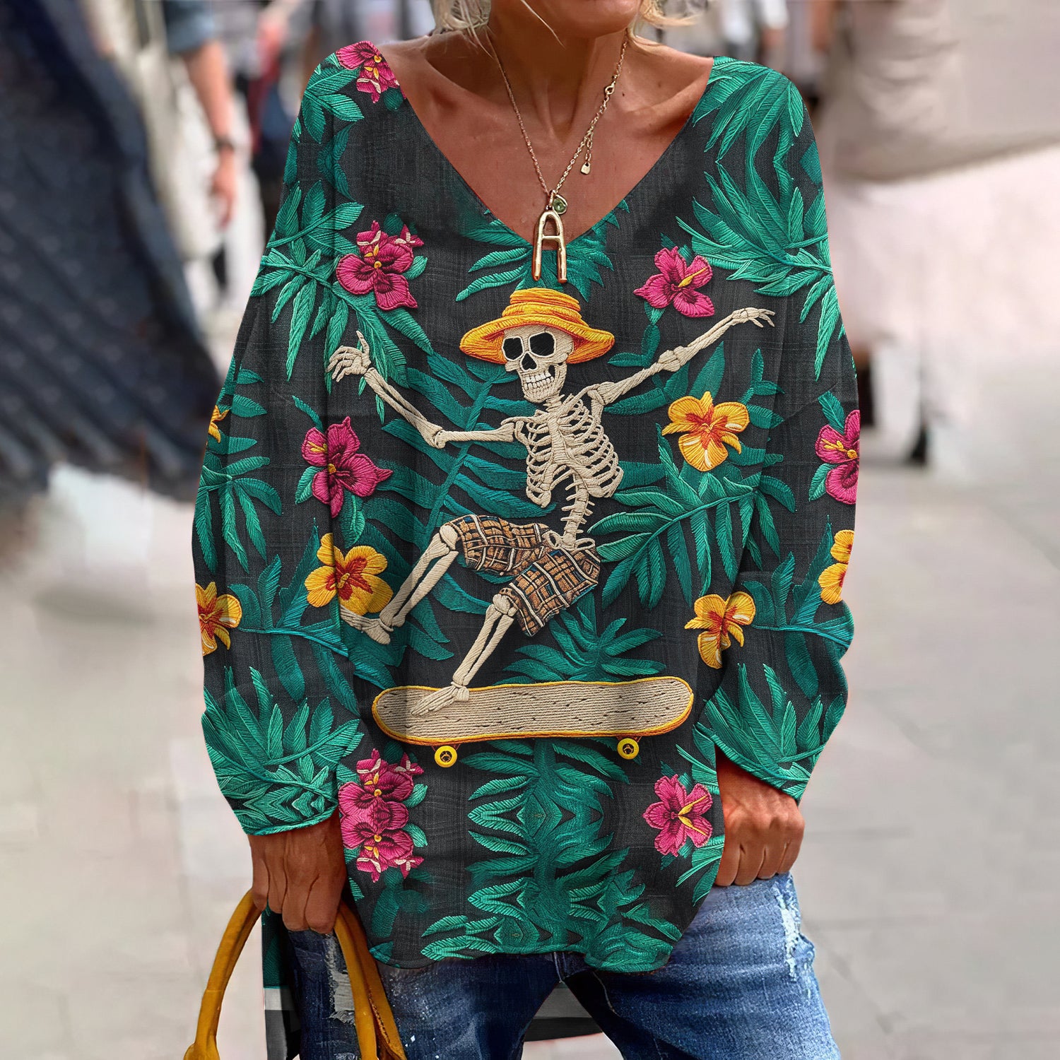 Mexican Day Of The Dead Inspired Pattern Art Printed V-Neck T-Shirt