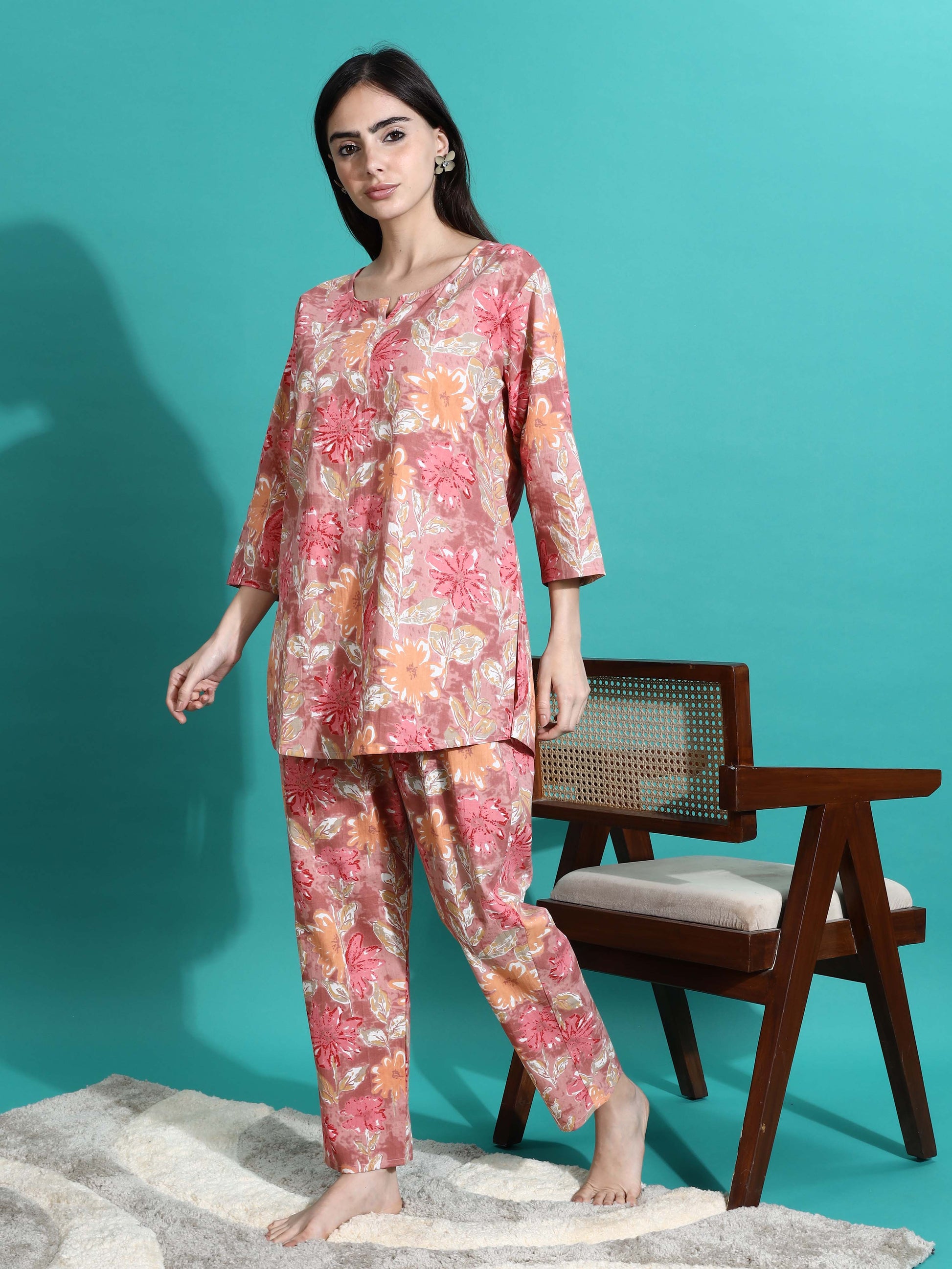 Pink Orange Floral Cotton Pajama Set for Women With Relax in Style
