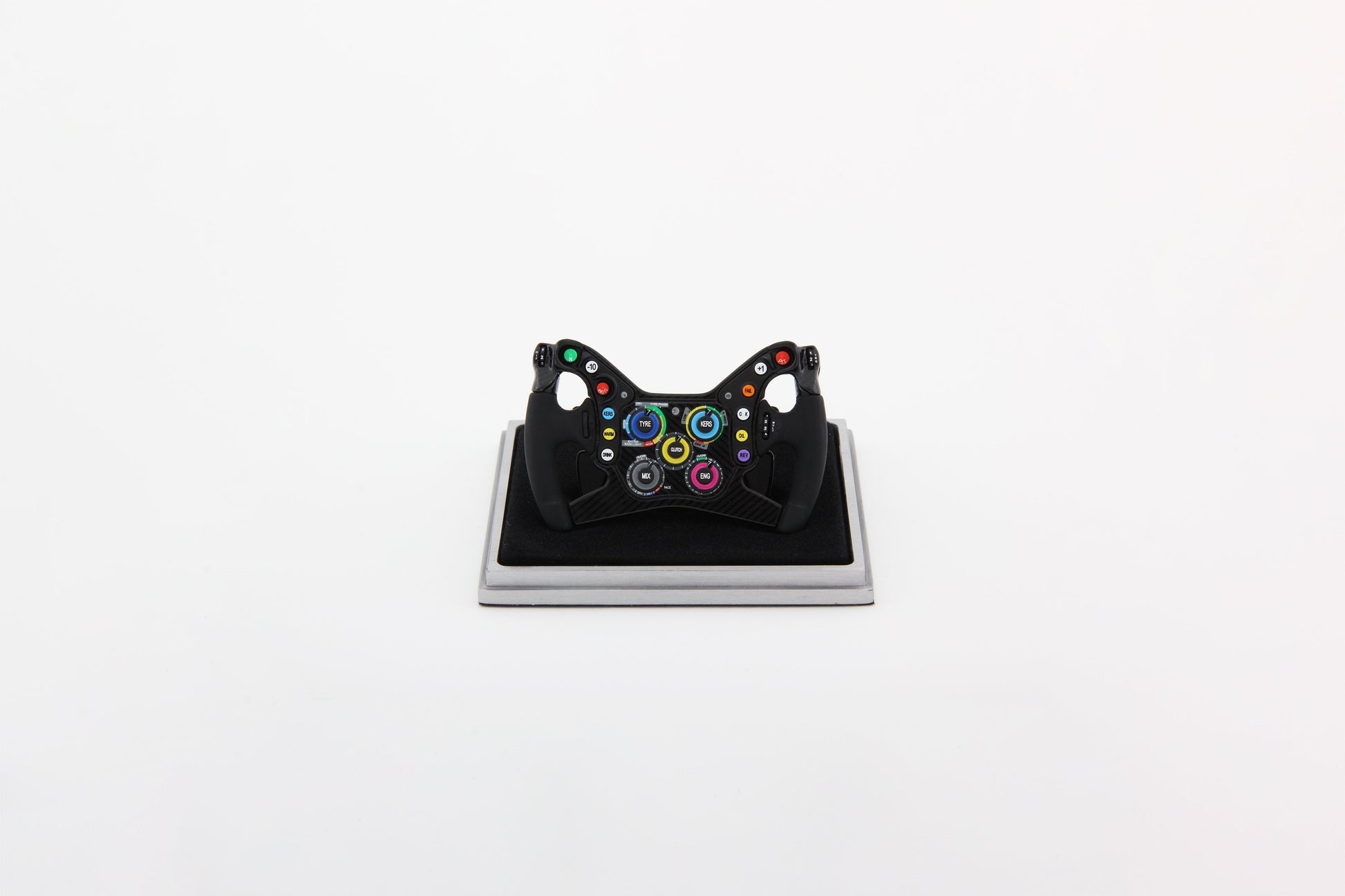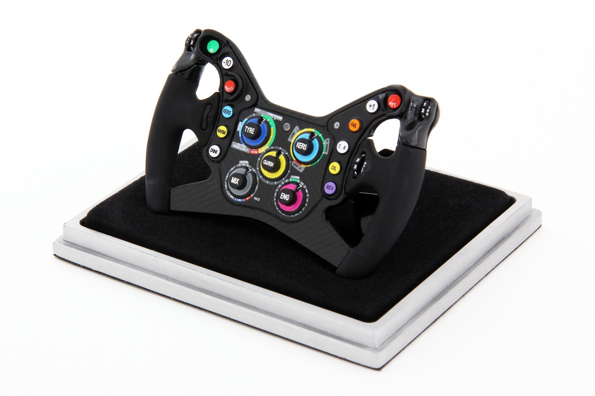 This fine 1:4 scale model of the Red Bull RB8 Steering Wheel has been handcrafted and finished in our workshops with the co-operation and assistance of the manufacturer regarding original finishes, materials, archive imagery and drawings. Furthermore, it has undergone detailed scrutiny by both engineering and design teams to ensure complete accuracy of representation.