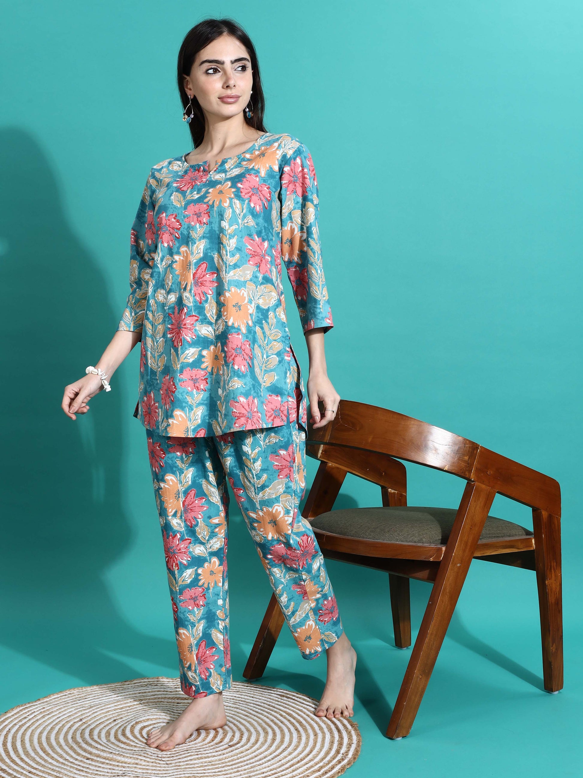 Teal Blue Printed Cotton Pajama Set for Women Cozy Nightwear