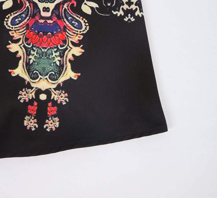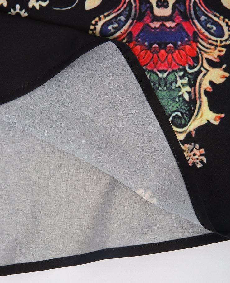 This artisan-inspired maxi dress features a beautiful vintage print placed on the sleeves, center, and bottom, balancing out the black material for a pleasing blend of solid and vibrant colors. The plunging round neck collar and long length add a whimsical summery vibe that is also perfect year-round. Pair this prairie dress with booties, flats, sneakers, and a jean jacket. Machine wash cold tumble dry low to medium heat. Please lay flat to dry.