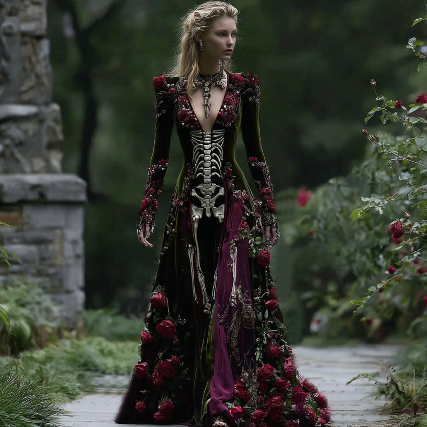 Women's Halloween Skeleton Patchwork Velvet V Neck Maxi Dress