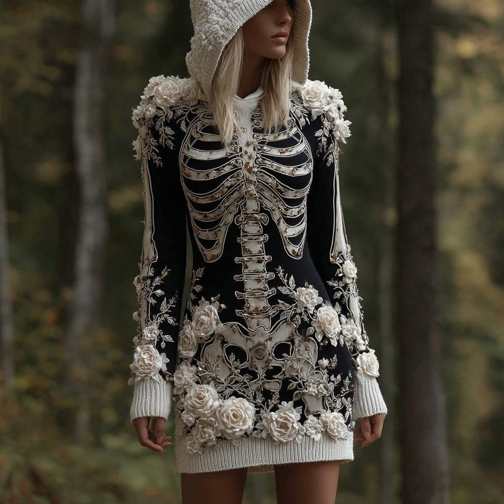 Women's Vintage Skeleton & White Rose Art Cozy Sweater Hooded Dress