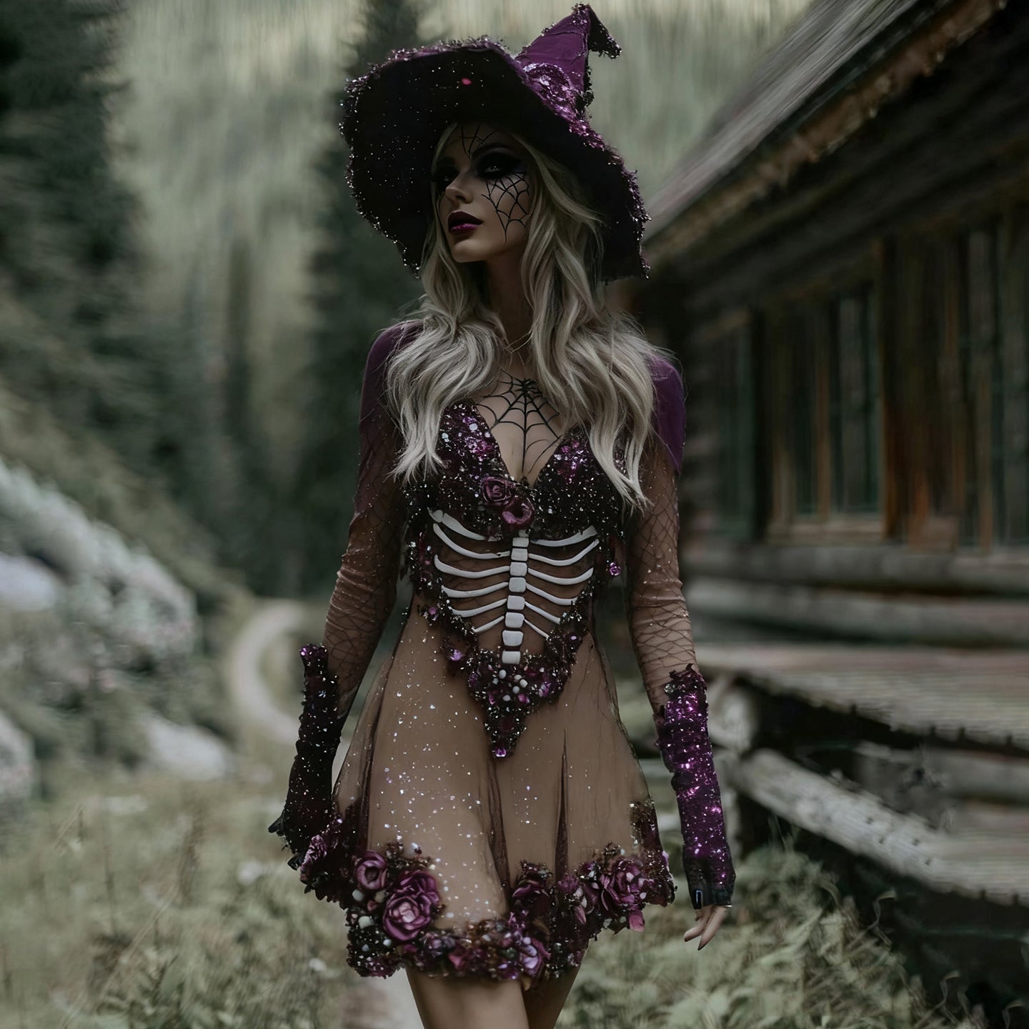 Women's Witch Rhinestone Skull Flower Midi Dress